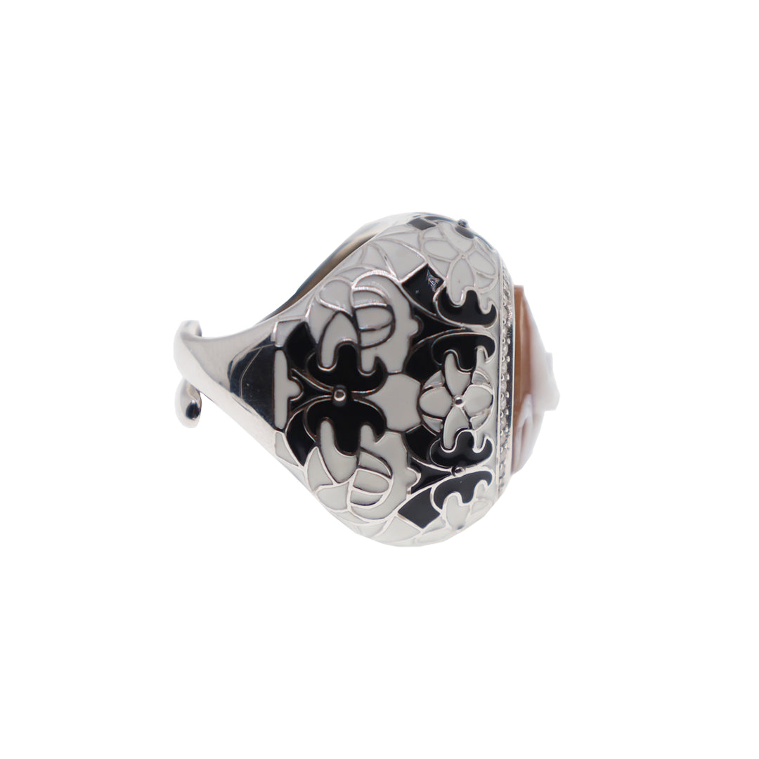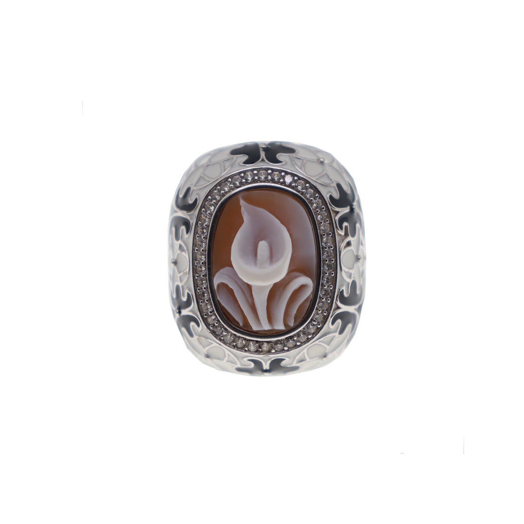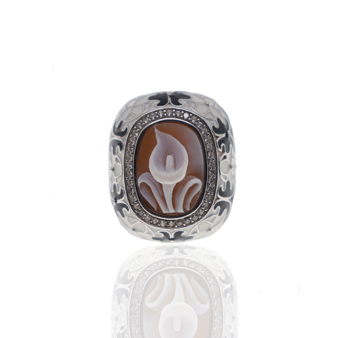 Calla lilies are gracefully shaped flowers sought after for special occasions and now you can bring them with you everywhere in this monumental cameo ring.  Complete with a cubic zirconia (CZ) halo and fabulous enamel detail in colors black and white.  Hand carved from Italy.  This ring is adjustable.  Go for bold!
