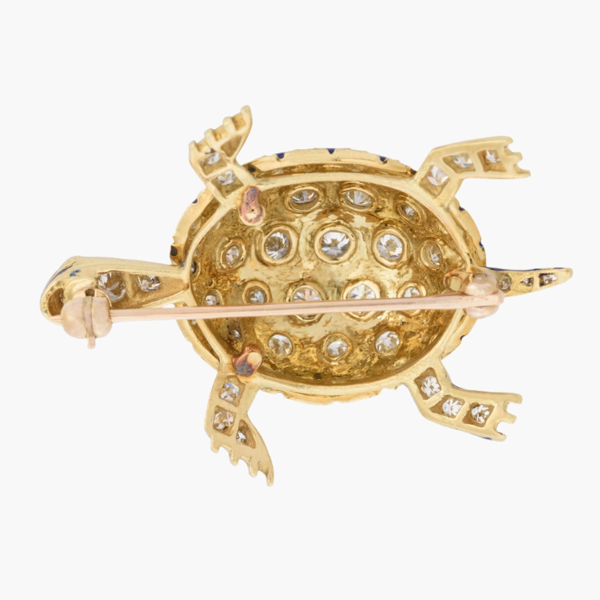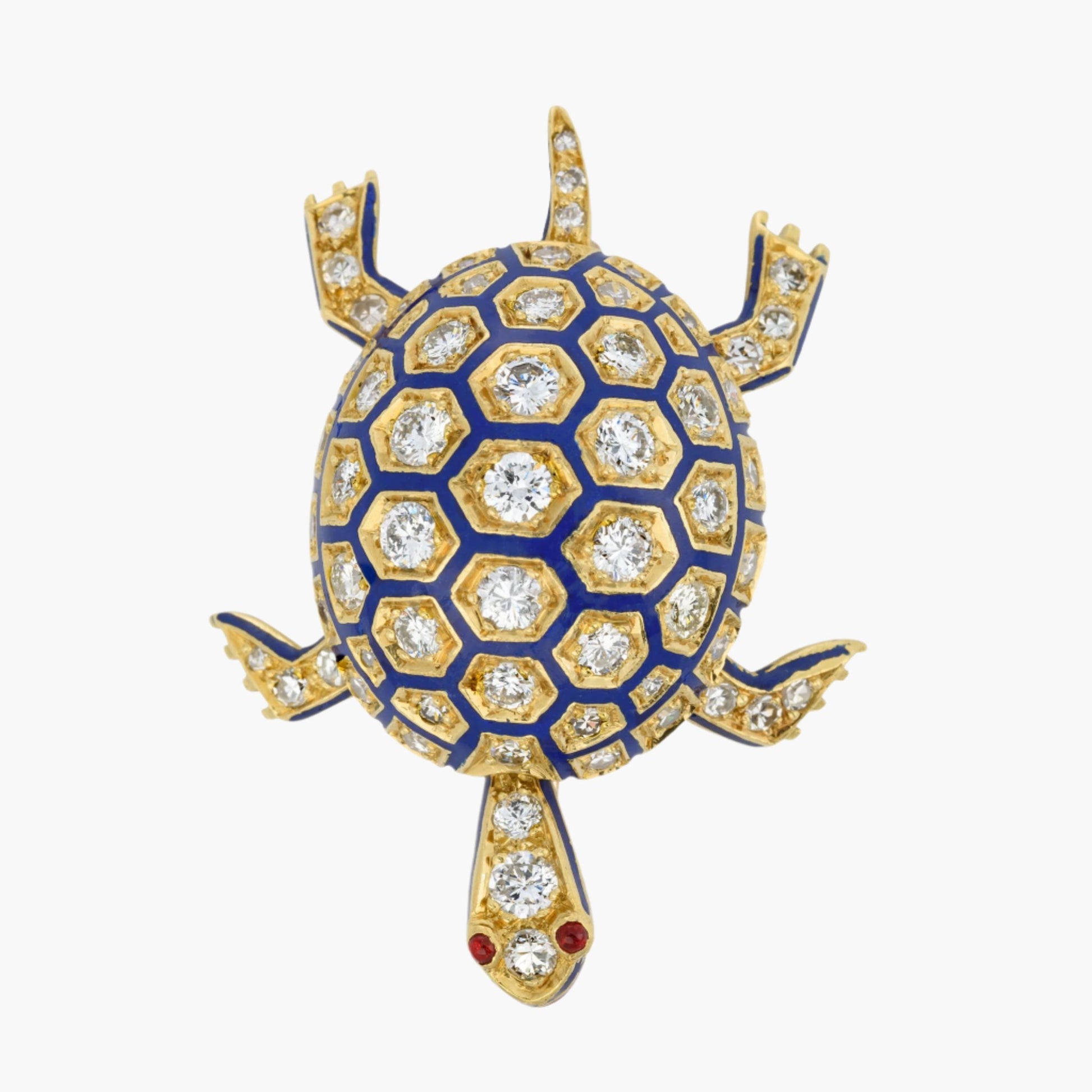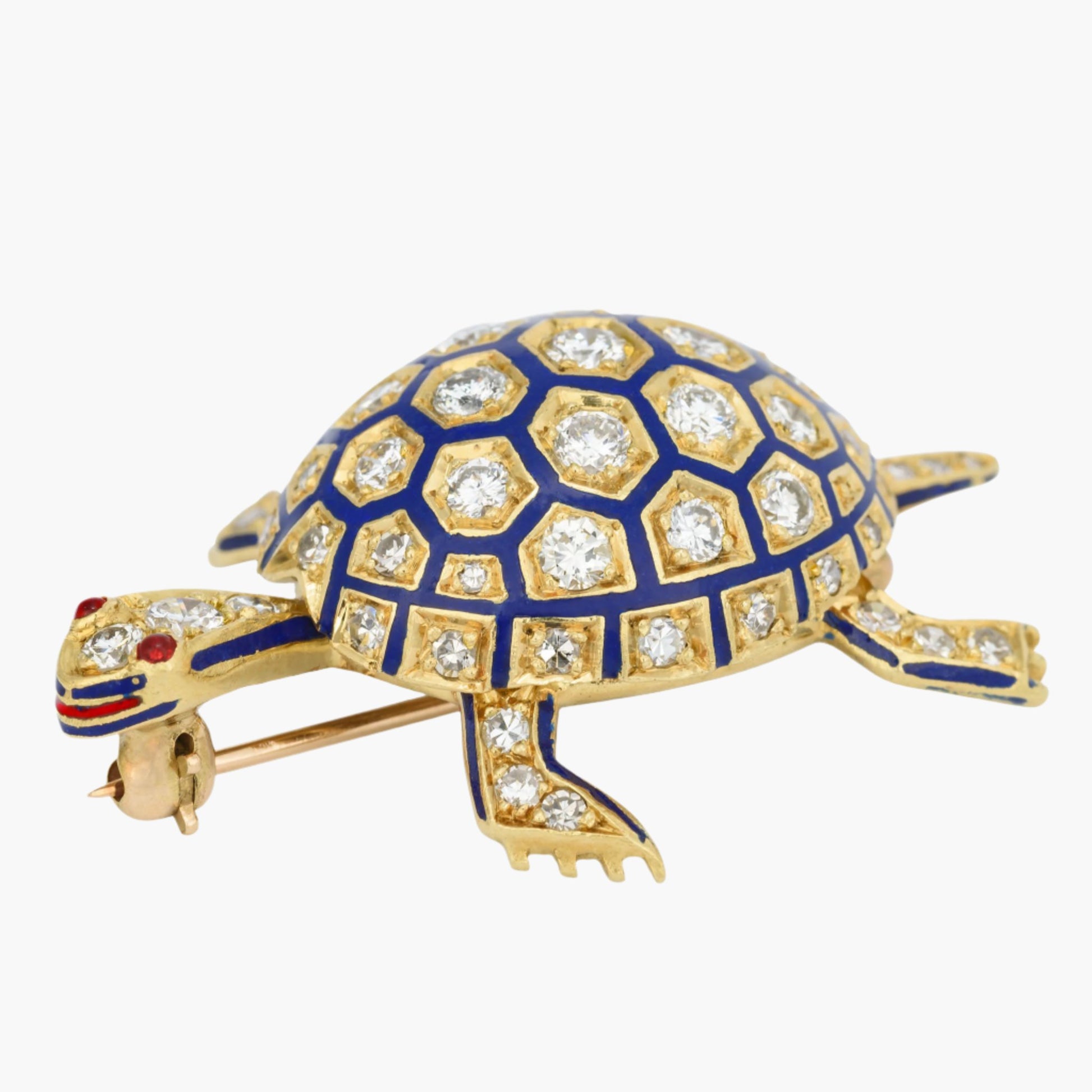 Our vintage, blue enamel turtle brooch is 18 karat yellow gold with a slight touch of red. This turtle brooch has a diamond accented domed shell adorned with blue and red enamel and round shaped, ruby cabochon eyes.