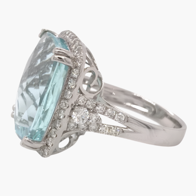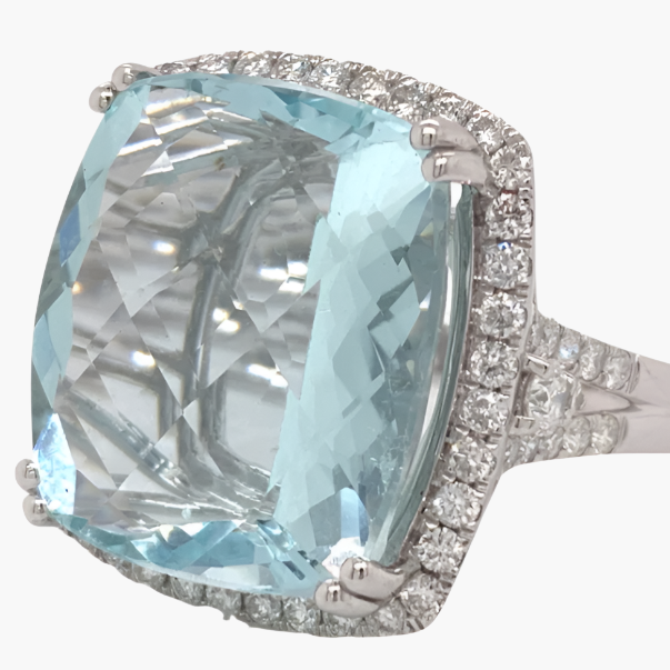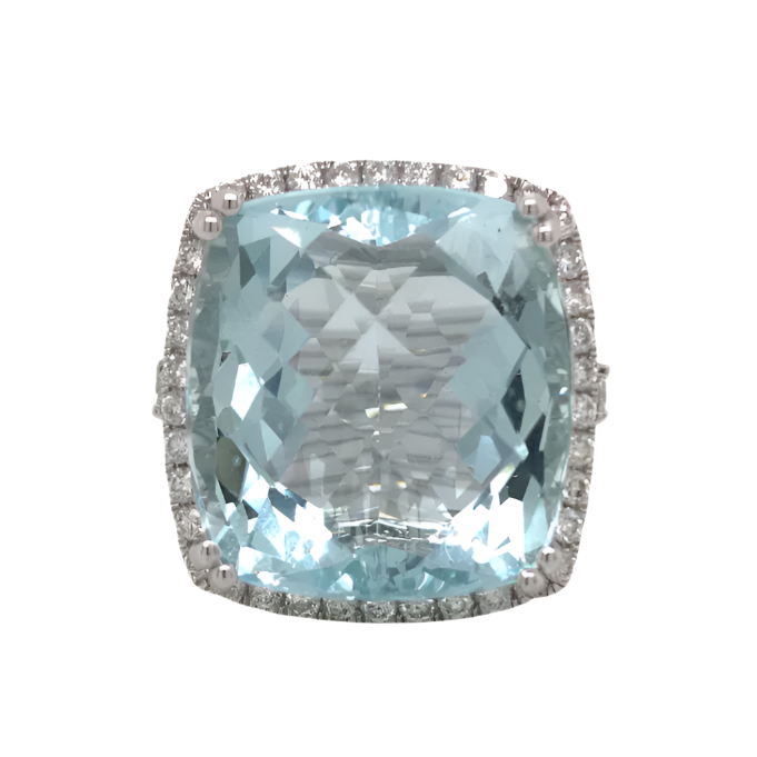 - Gem Measurements: Aquamarine 17.90 x 16.72 x 10 mm approximate, Diamonds 1.18 total carat weight