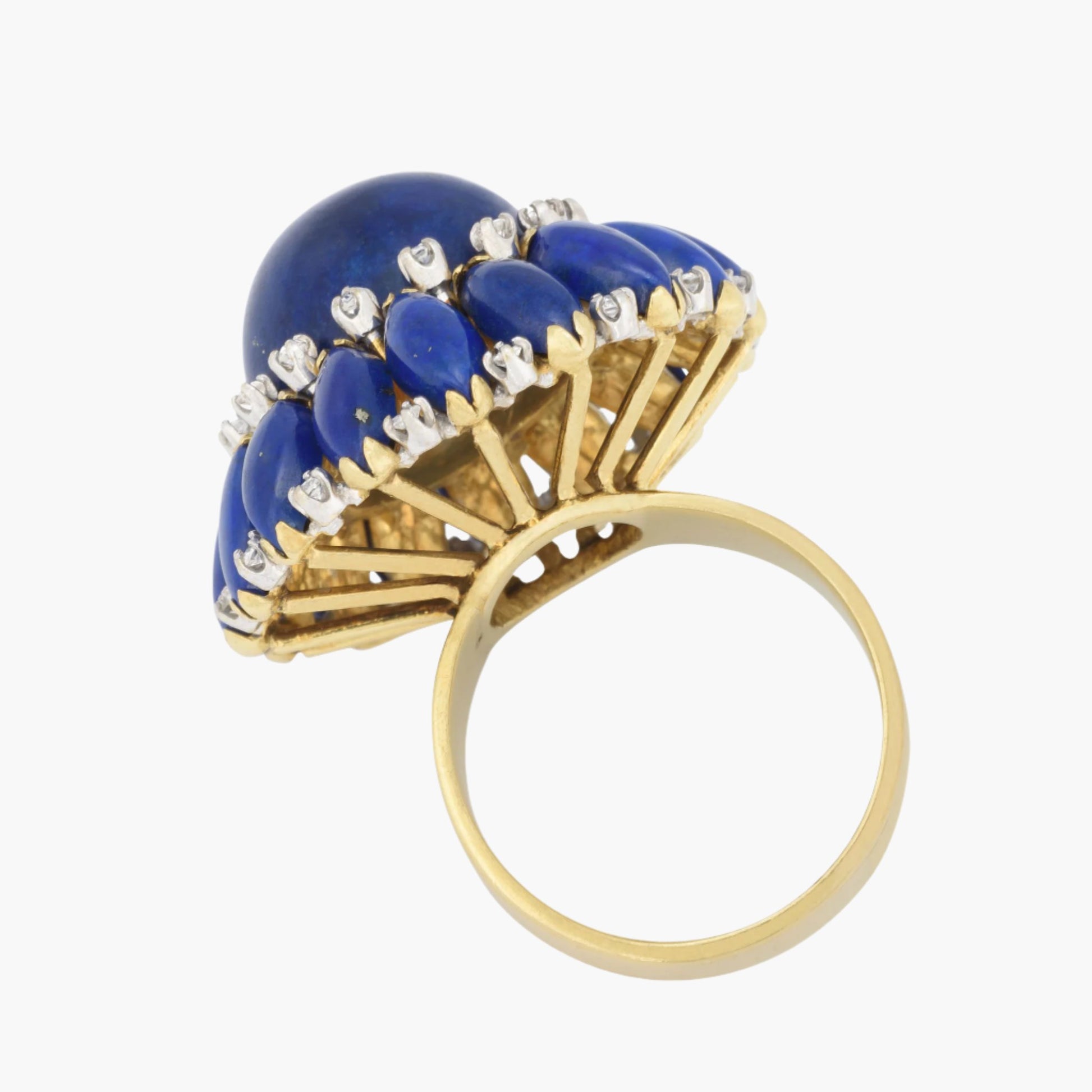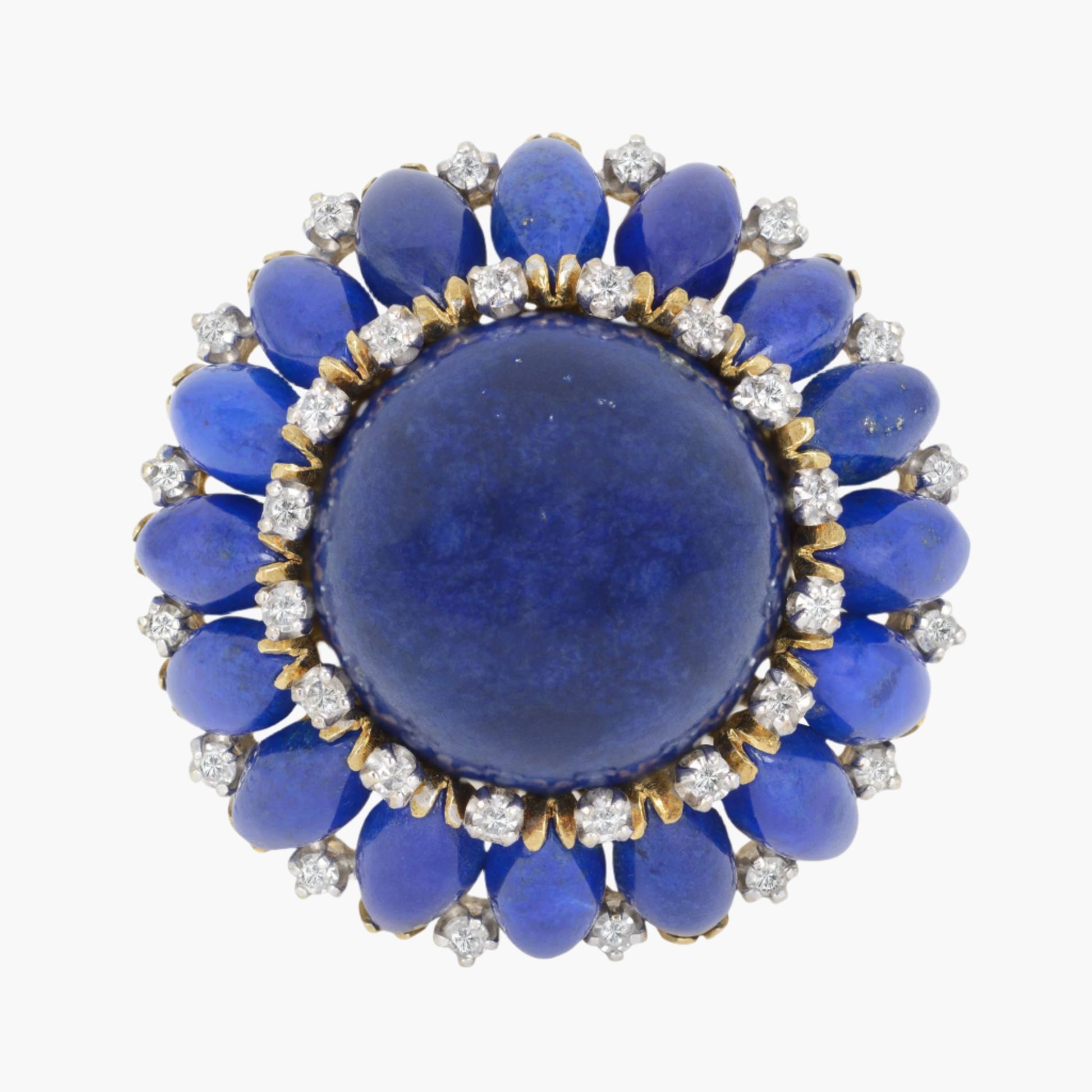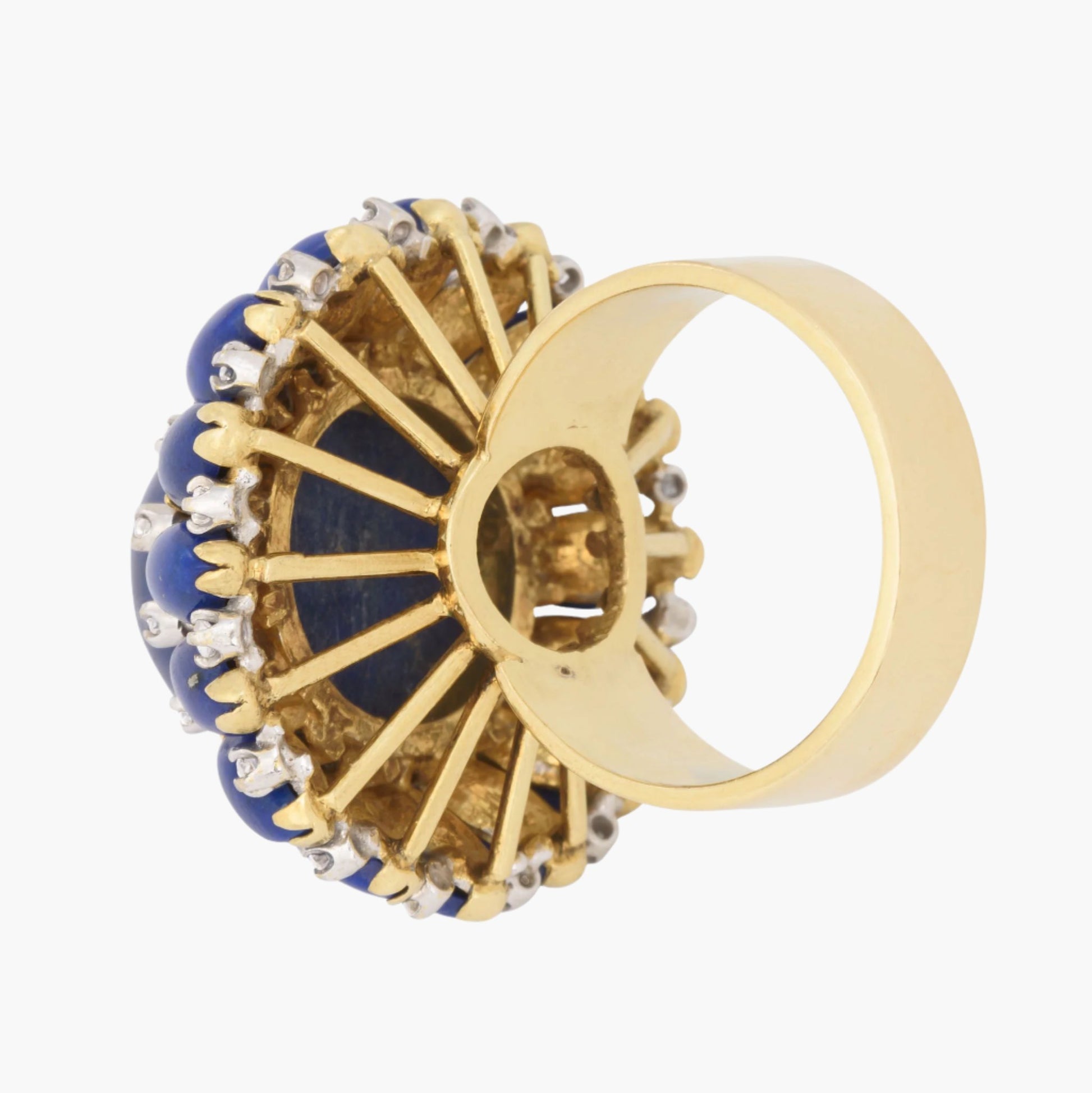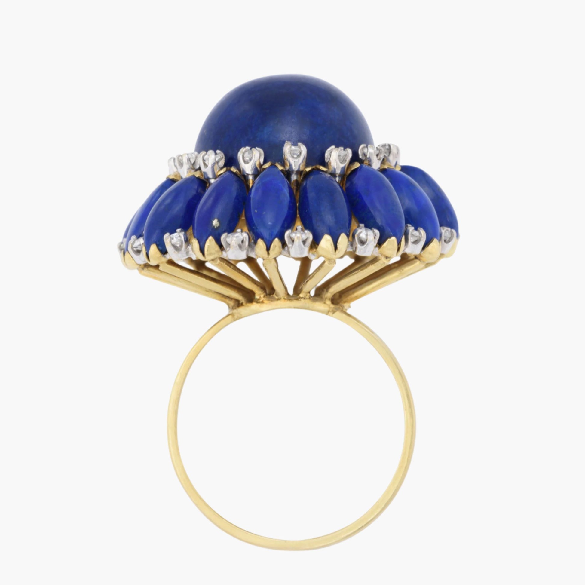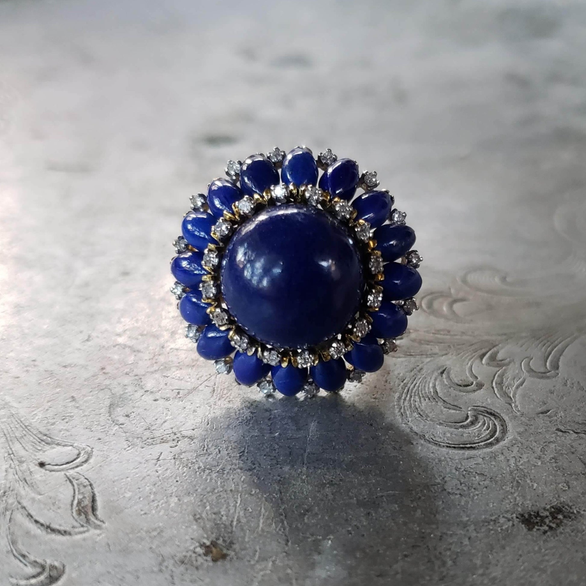 This Lapis Lazuli Domed Cabochon Cocktail Ring is accented with a double halo of diamonds, set in 18 karat yellow gold.  Circa 1960's.  Lapis Lazuli is a deep blue semi precious stone of metamorphic rock with intense color observed in antiquity. This item comes with independent appraisal.  Big & Blue!  Only 1 available.  In Stock.