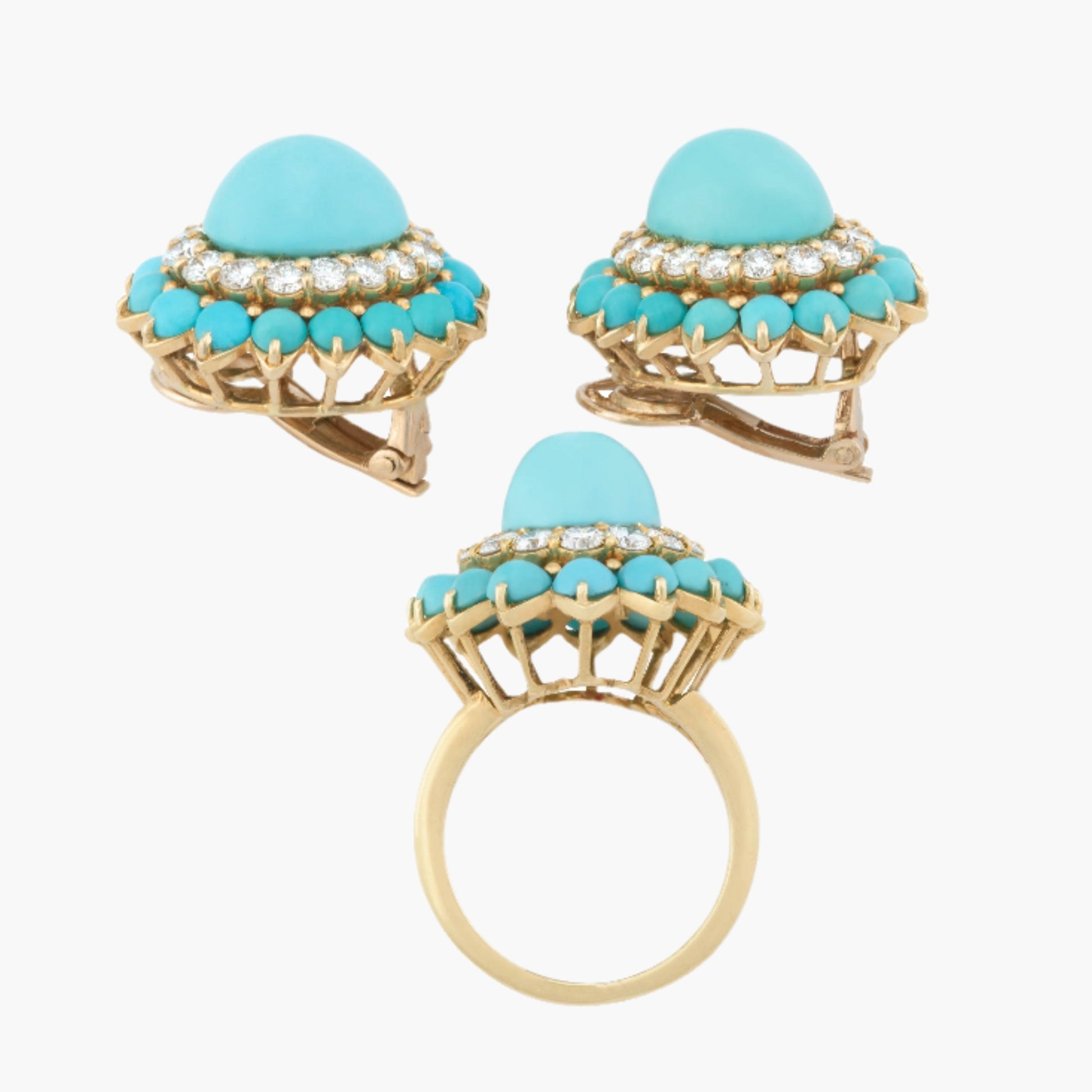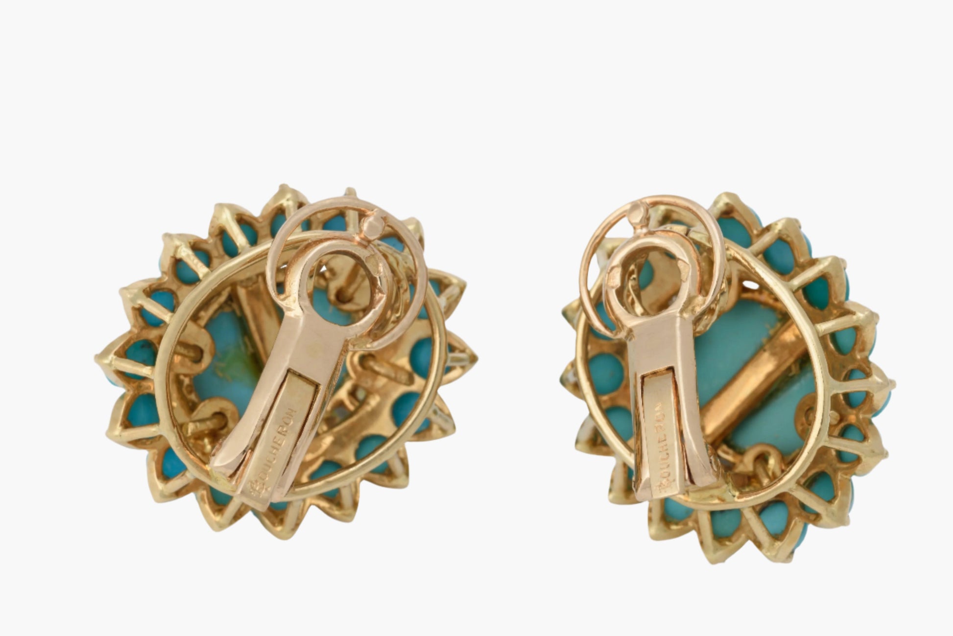 Boucheron turquoise yellow gold diamond double halo style earrings. The most charming pair of turquoise earrings. Hallmarked Boucheron French Assay. Matching ring sold separately. This is part of a matching suite or set. The Boucheron matching ring is sold separately and can be part of a combined offering. 1 In Stock. This item is pre-owned.