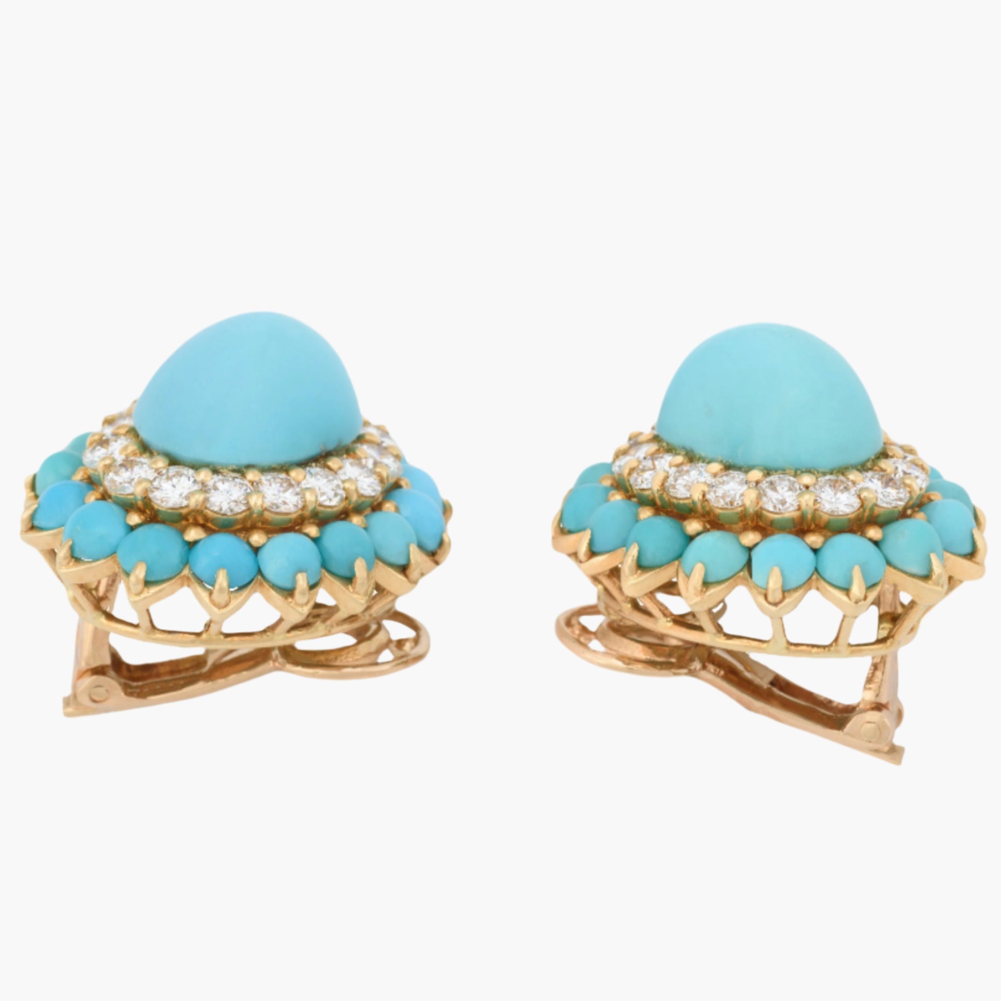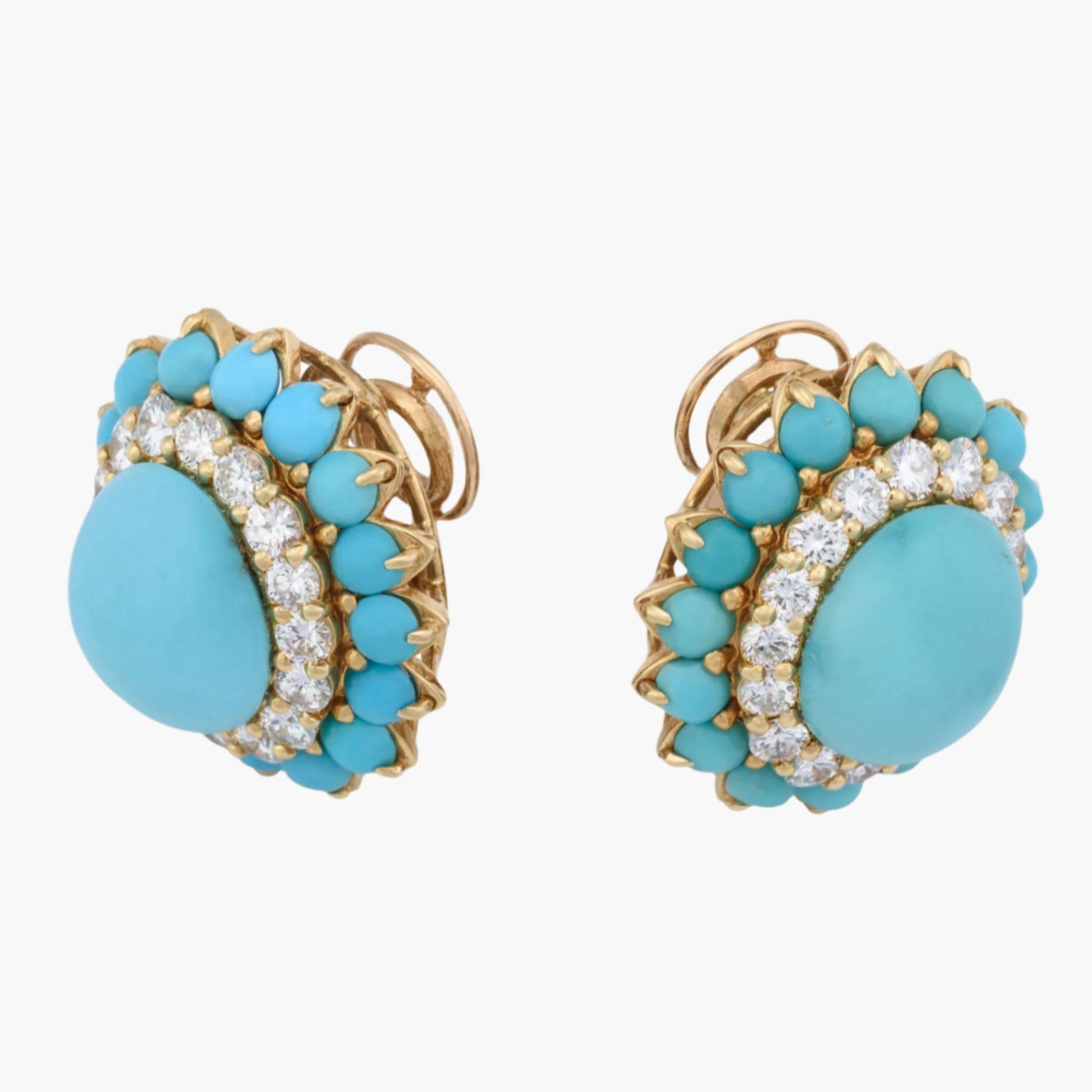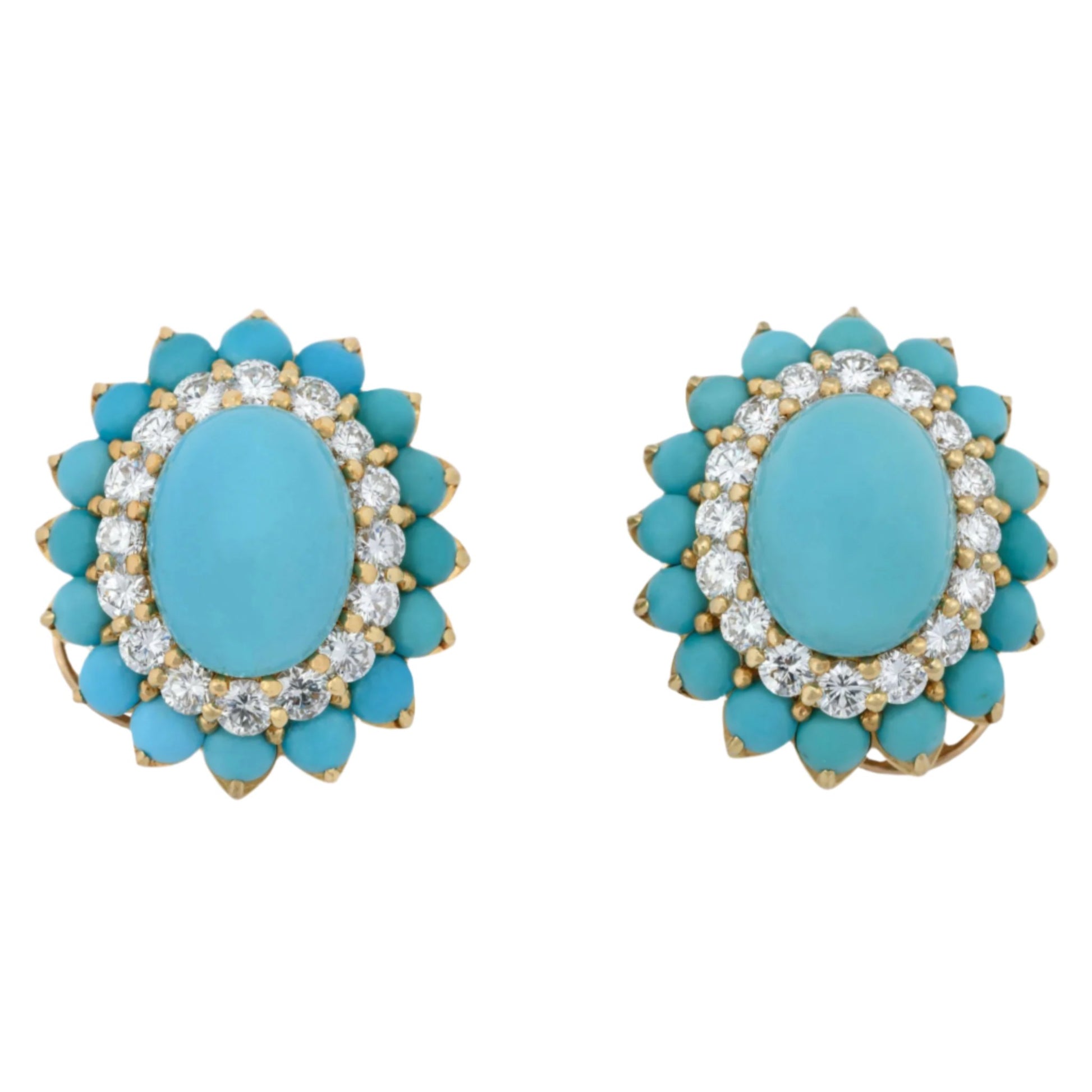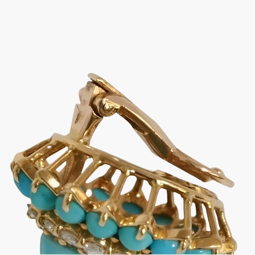 Boucheron mid Twentieth Century, 18k Gold Earrings centered with cabochon Oval Turquoise. Yellow gold set with 2.72 carats diamonds weight. Clarity VVS, Color F-G, Cut: Very Good