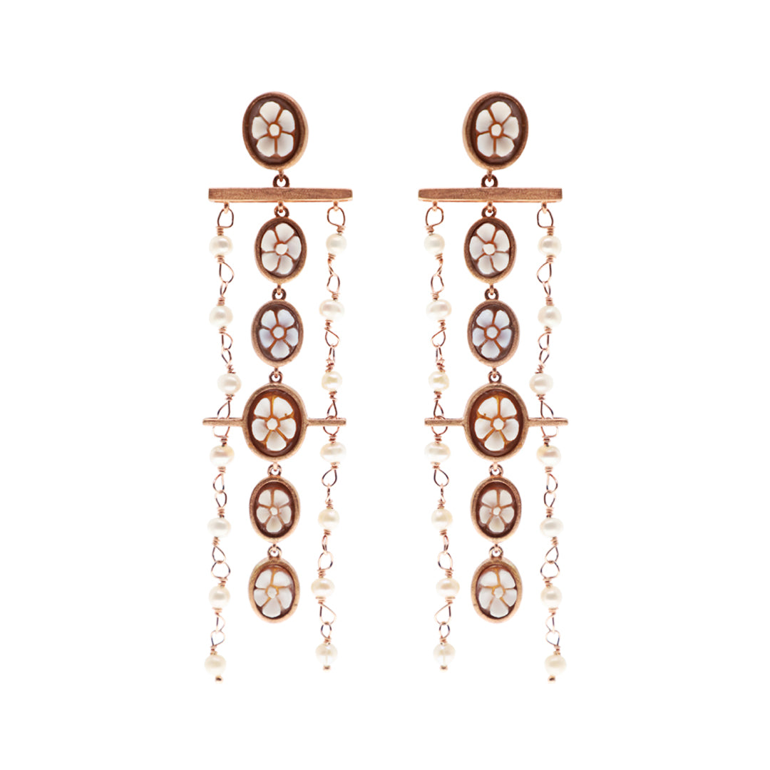 Step into the spotlight with our Cameo Oval Fiore Chain Earrings with cultured freshwater pearl accents.  These Cameo feature a flower motif.  Post Back.
