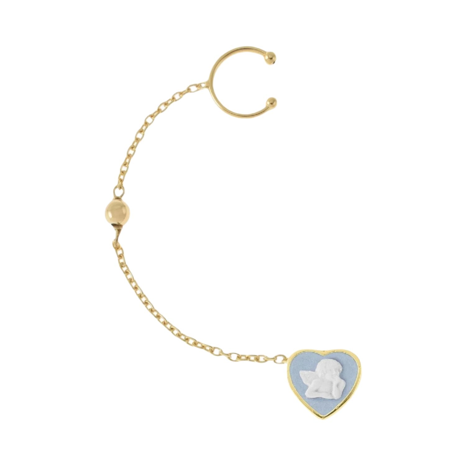 Cherub Single Earrings.  Made of fine porcelain.  Crafted in Italy.  These small objects of art symbolize Italian artisanal excellence.  This single earring is made from fine porcelain heart motif & styled with an angel or cherub in relief.  The earring is comprised of a single heart stud with chain detail.  The cherub single earring will provide you with yet another option to enhance your current earring stack or just wear solo.  Imported.  Crafted in gold vermeil.