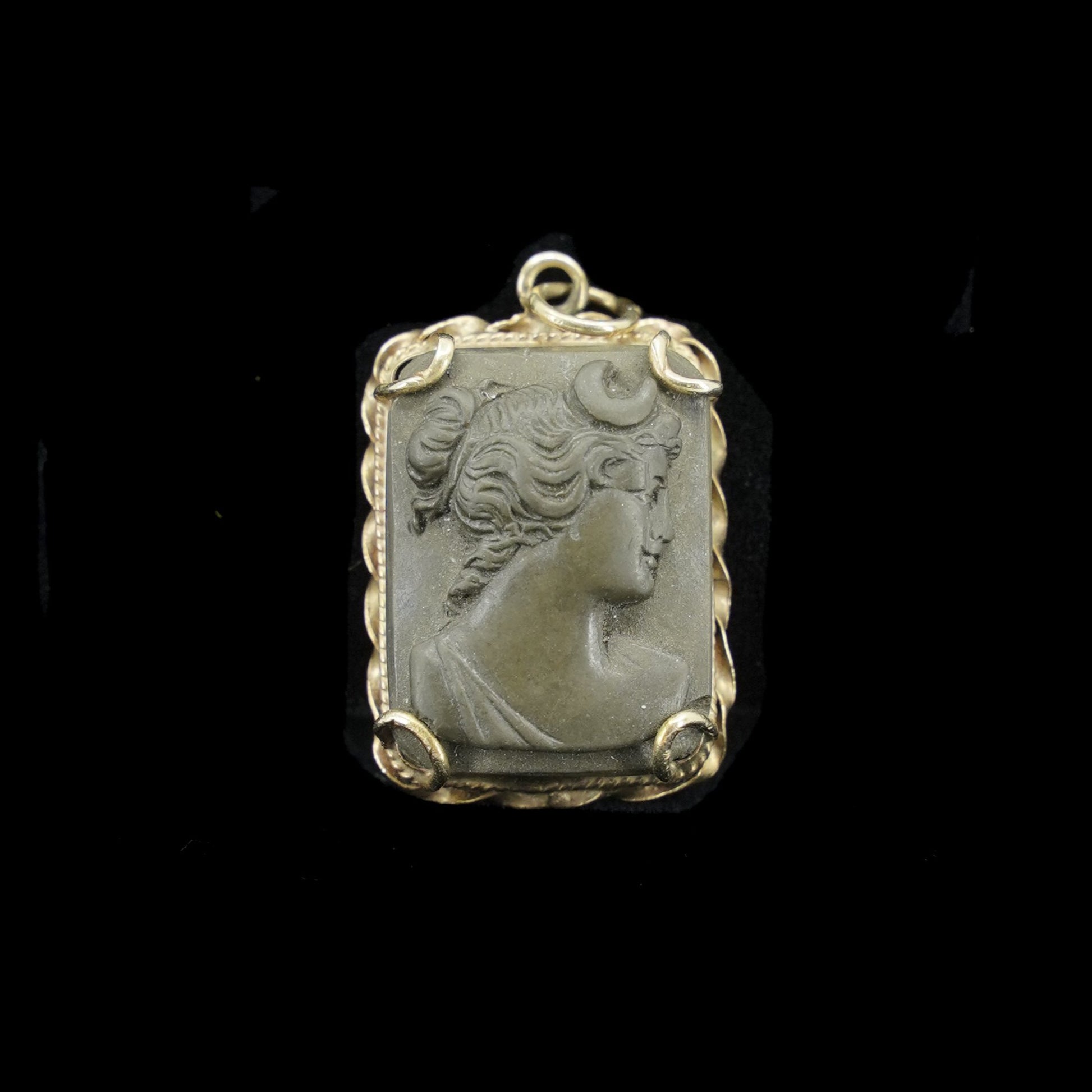 Vintage 14 karat yellow gold Cameo lava carved pendant. Rectangle in shape. Carved Lava Cameo of Diana with Crescent Moon on her head. Called Diana by the Romans and the goddess Artemis by the Greeks both are depicted with crescent moons. Right facing cameo in higher relief. Authentic. In Stock.