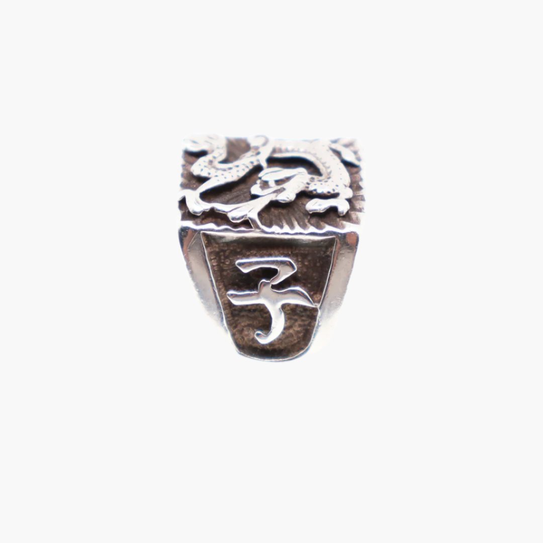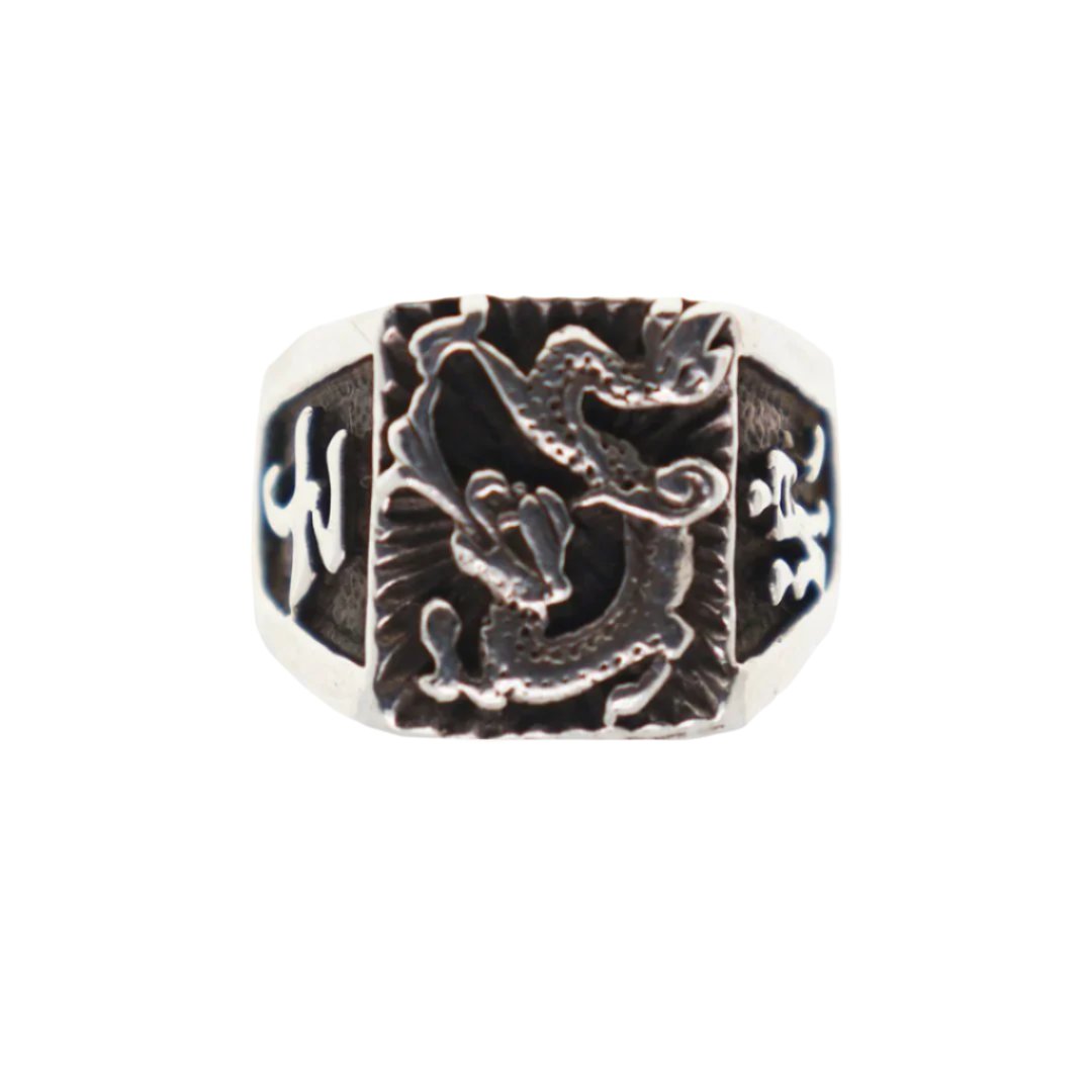 This item is pre-owned. The Dragon Ring was originally purchased in Hong Kong. The ring is in silver with fiery dragon motif. Only one available.
