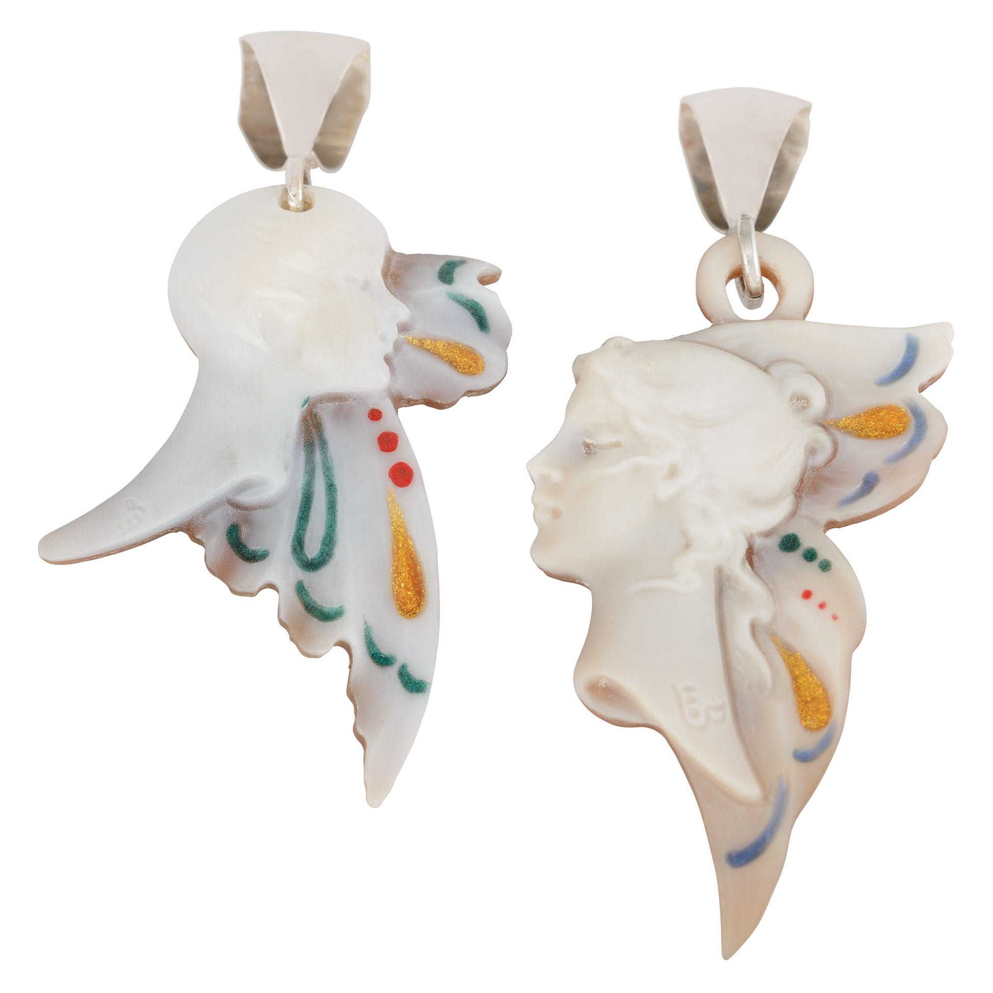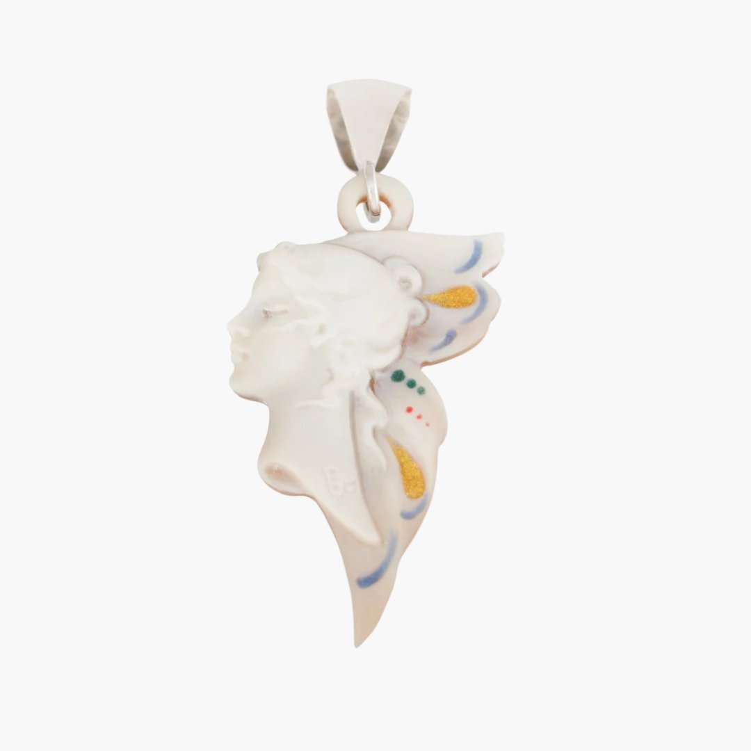 A true work of art. This beauty is a natural shell pendant. The Butterfly Winged Cameo Pendant. The bail is sterling silver. Natural shell carving of woman in profile with enamel; the enameled Cameo is carved into shell and then color or enameling is added in some point(s) or areas with pearlescent from Visa TM. This Cameo is New, from Italy, and part of our 21st Century Cameo Collection.