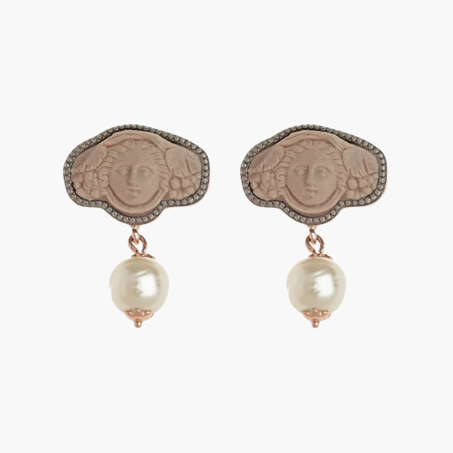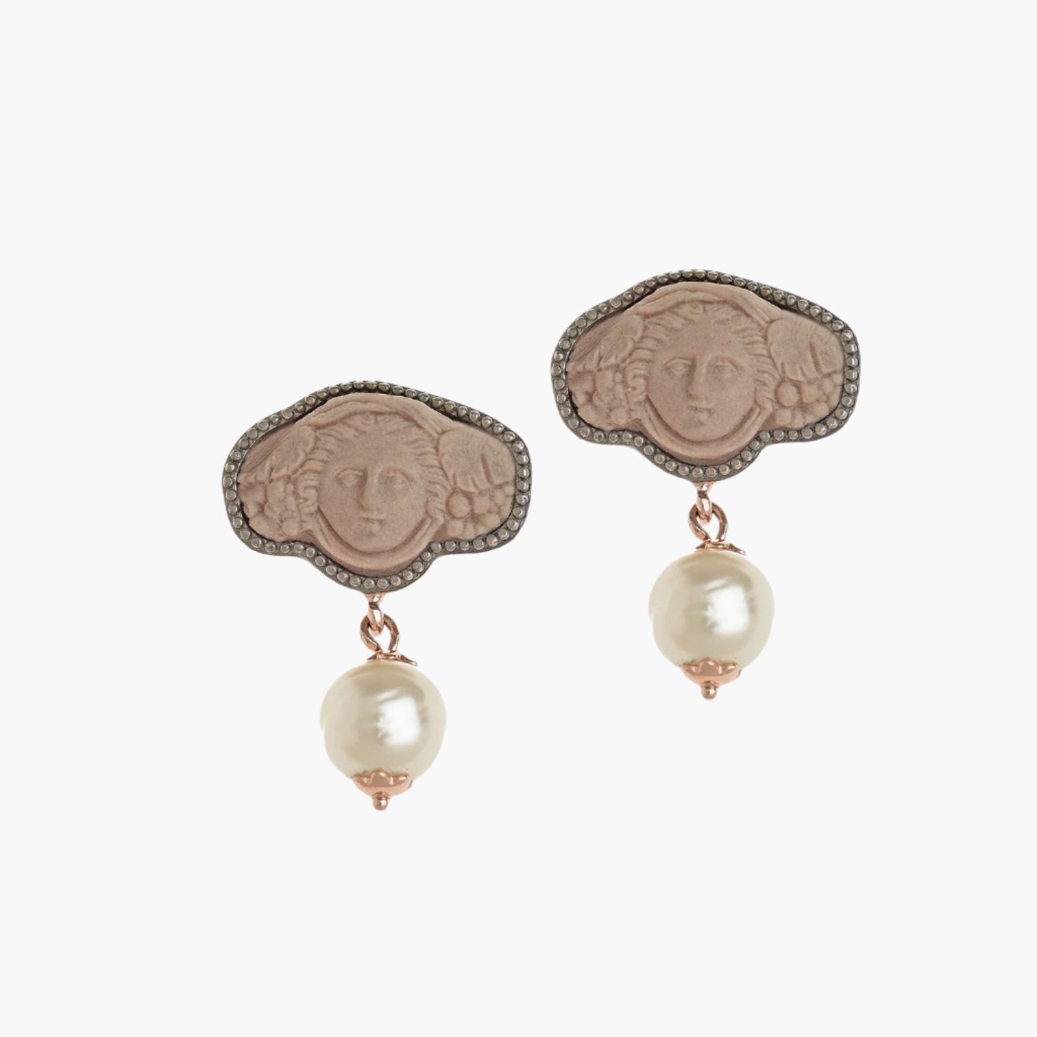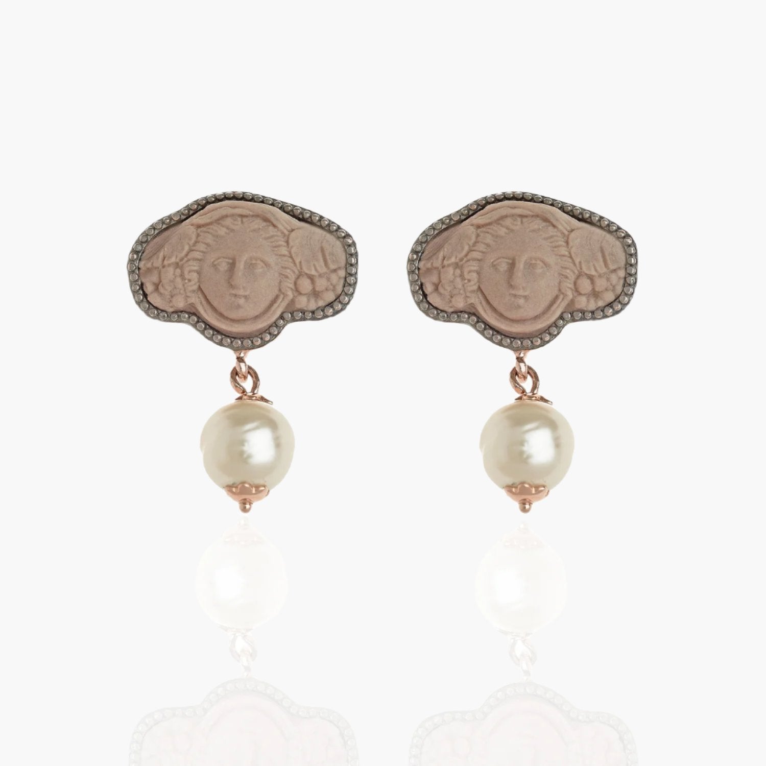 Greek Medusa Cameo Wide Stud Earrings with Freshwater Pearl Dangle
