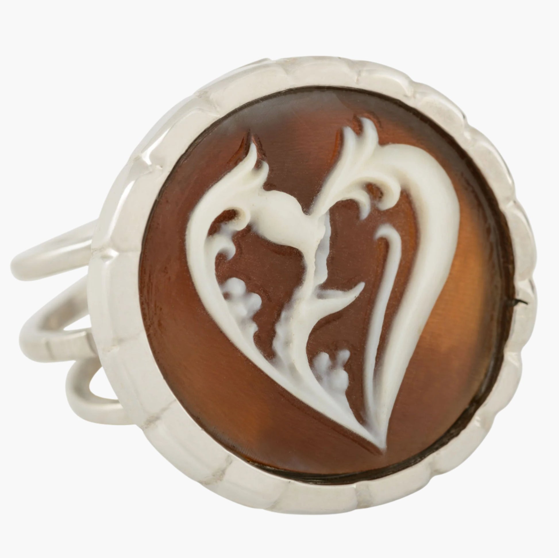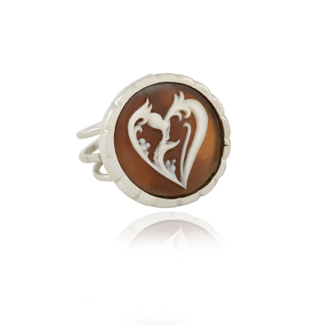 The Heart Cameo Adjustable Ring. This natural shell cameo ring features a heart in floral motif carving in profile. The cameo ring is adjustable for comfort and more flexibility for the wearer. Low relief, bezel set. Imported from Italy and carved by artist Agostino Centobelli. Authentic 21st century cameo jewelry.