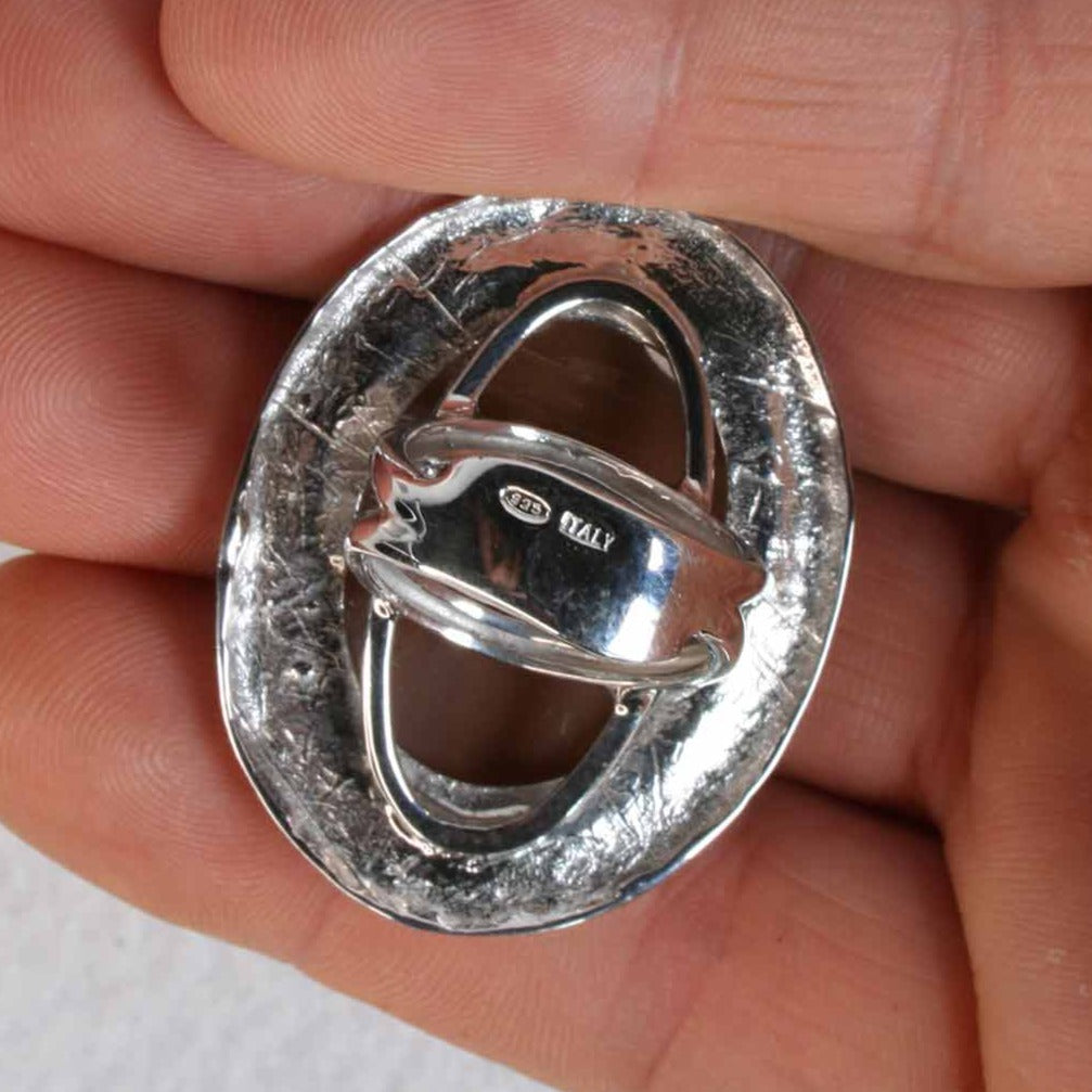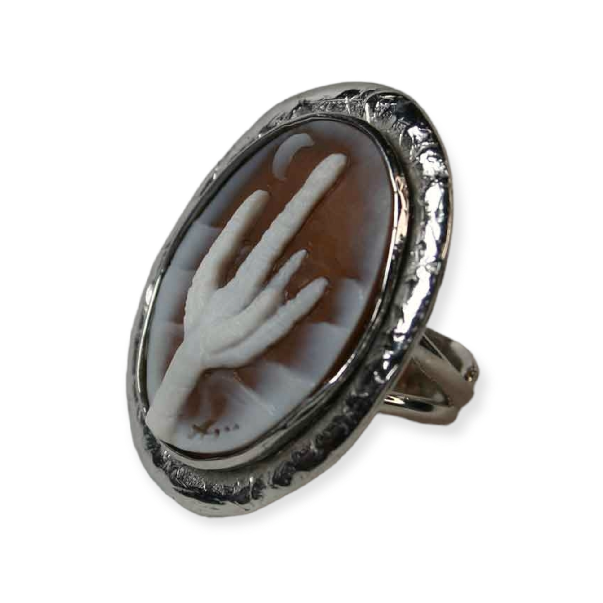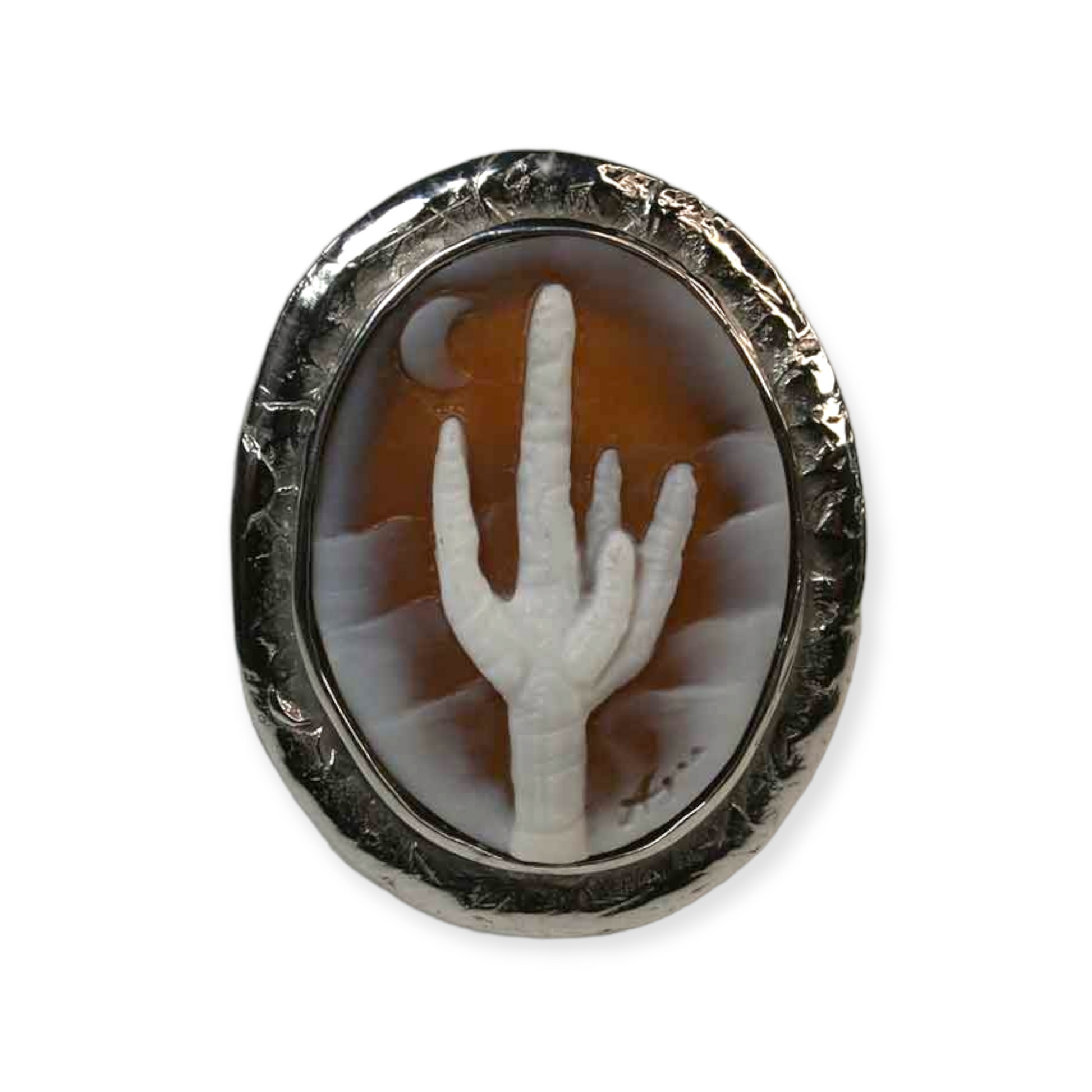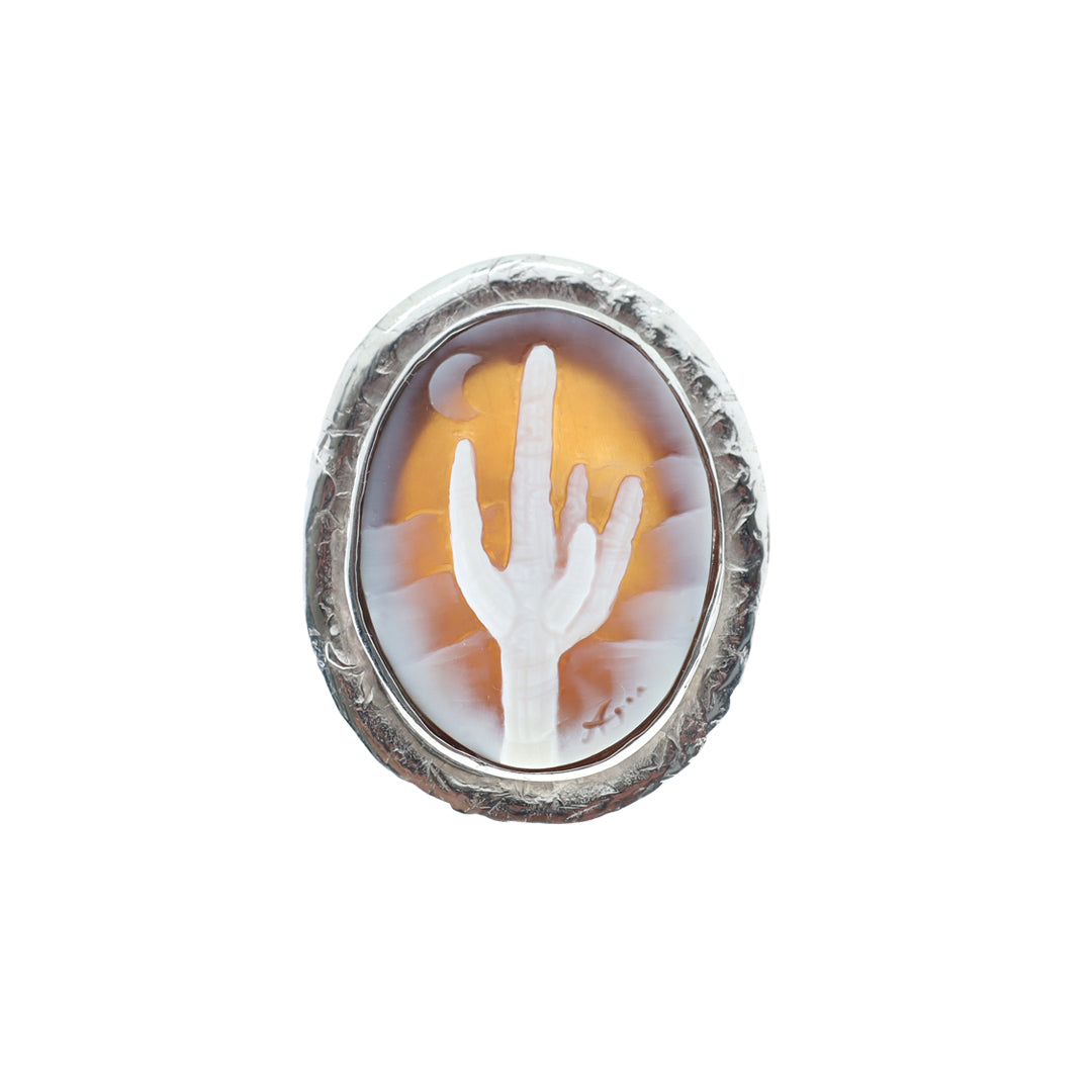 Ode to the Old Saguaro Cactus Cameo Ring is available.  Our saguaro cactus cameo ring is set in sterling silver.  This remarkable ring is dedicated to the cactus iconic to the American Southwest and adorns the landscape of our neighbor state Arizona with such beauty.  Oval in shape.  Exquisite in execution and signed by cameo artist, Agostino Centobelli.  Imported from Italy for Cameo Calamity.  Presenting the Old Saguaro Cameo Ring in the Moonlight.  (two types of lighting used in photography)