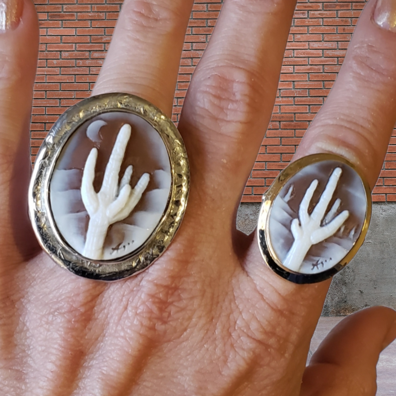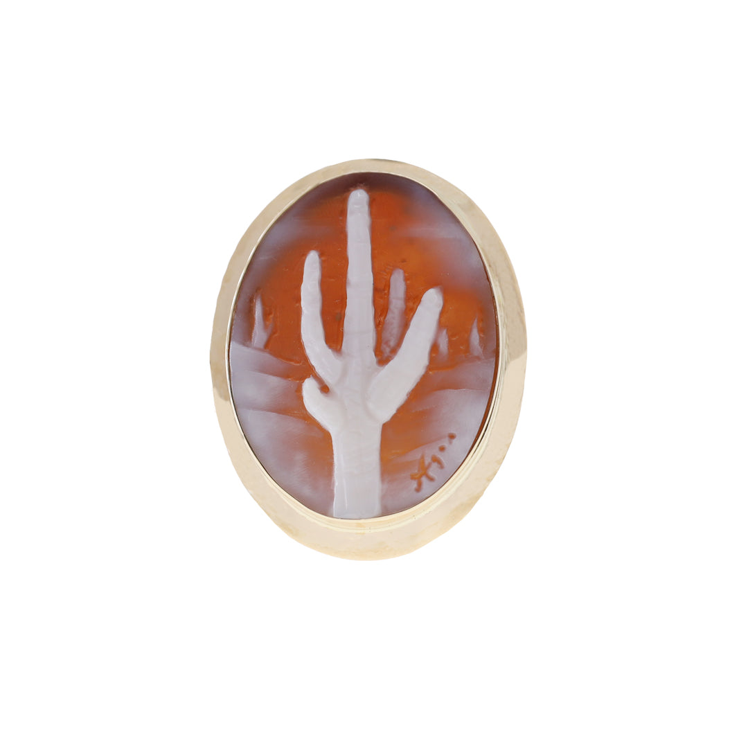 Ode to the Old Saguaro Cactus. This cameo ring carving is that of the saguaro cactus. Bezel set in 14 karat yellow gold. This remarkable cactus fills the landscape of our neighbor state Arizona with such a rare beauty. Oval in shape. Exquisite in execution and signed by cameo artist, Agostino Centobelli. Imported from Italy for Cameo Calamity. Presenting the Old Saguaro II Cameo Ring.