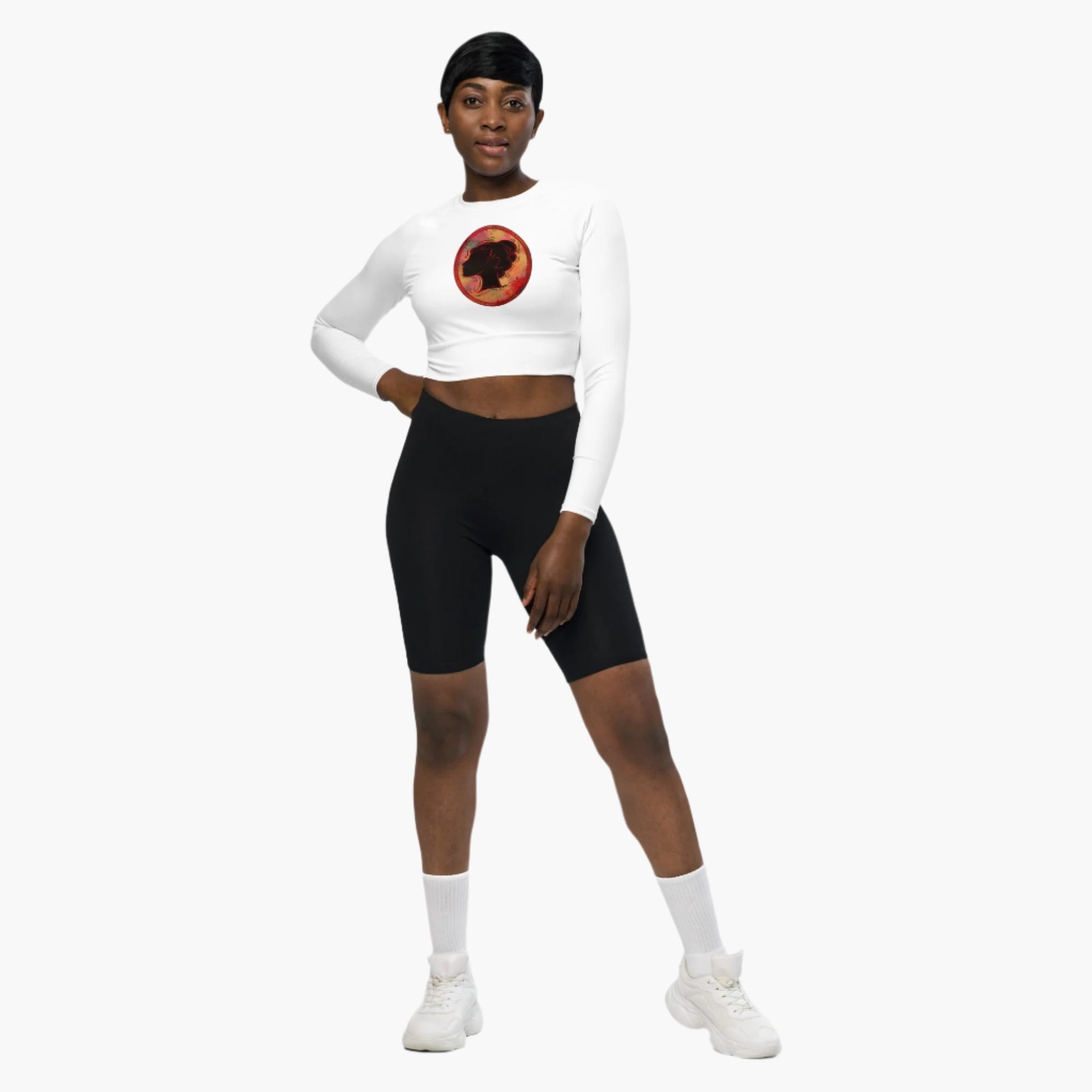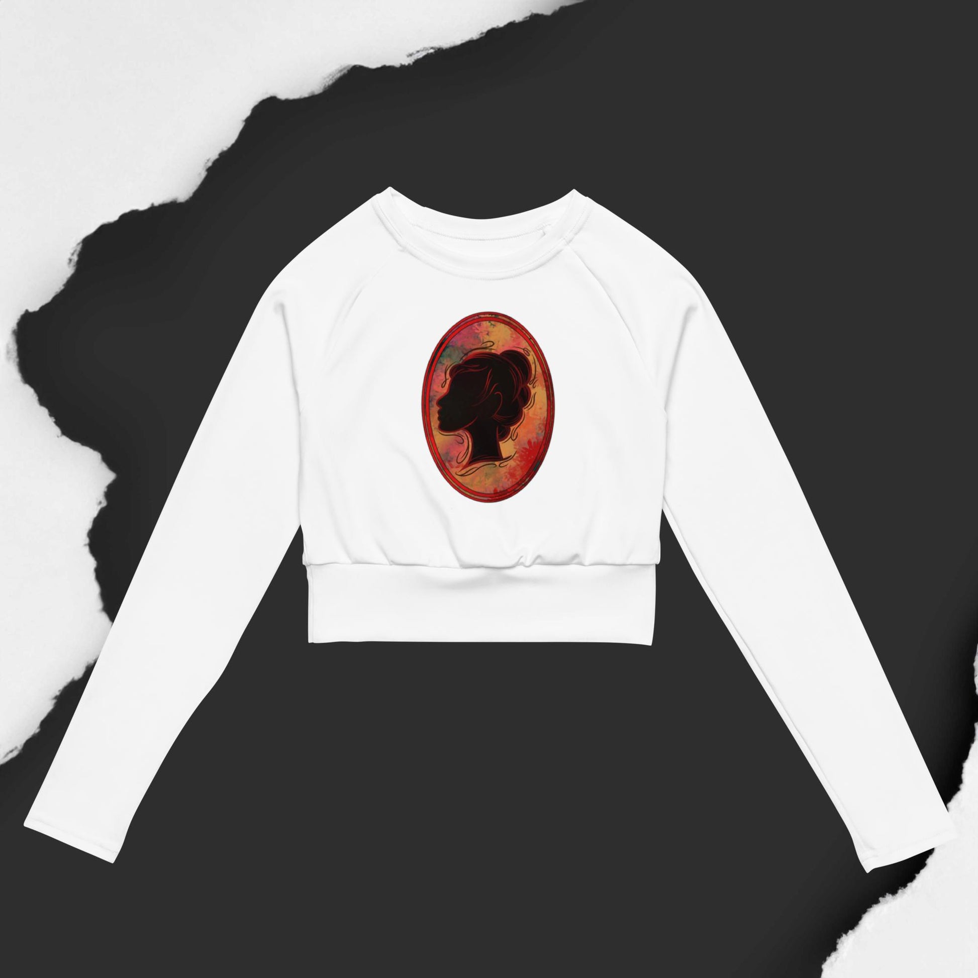 This long-sleeve crop top is made of recycled polyester and elastane, making it an eco-friendly choice for swimming, sports, or athleisure outfits. The crop top has a tear-away care label and a wide, double-layered waistline band for a comfortable fit.  Artwork produced by Cameo Calamity, LLC, Las Vegas, Nevada, USA.