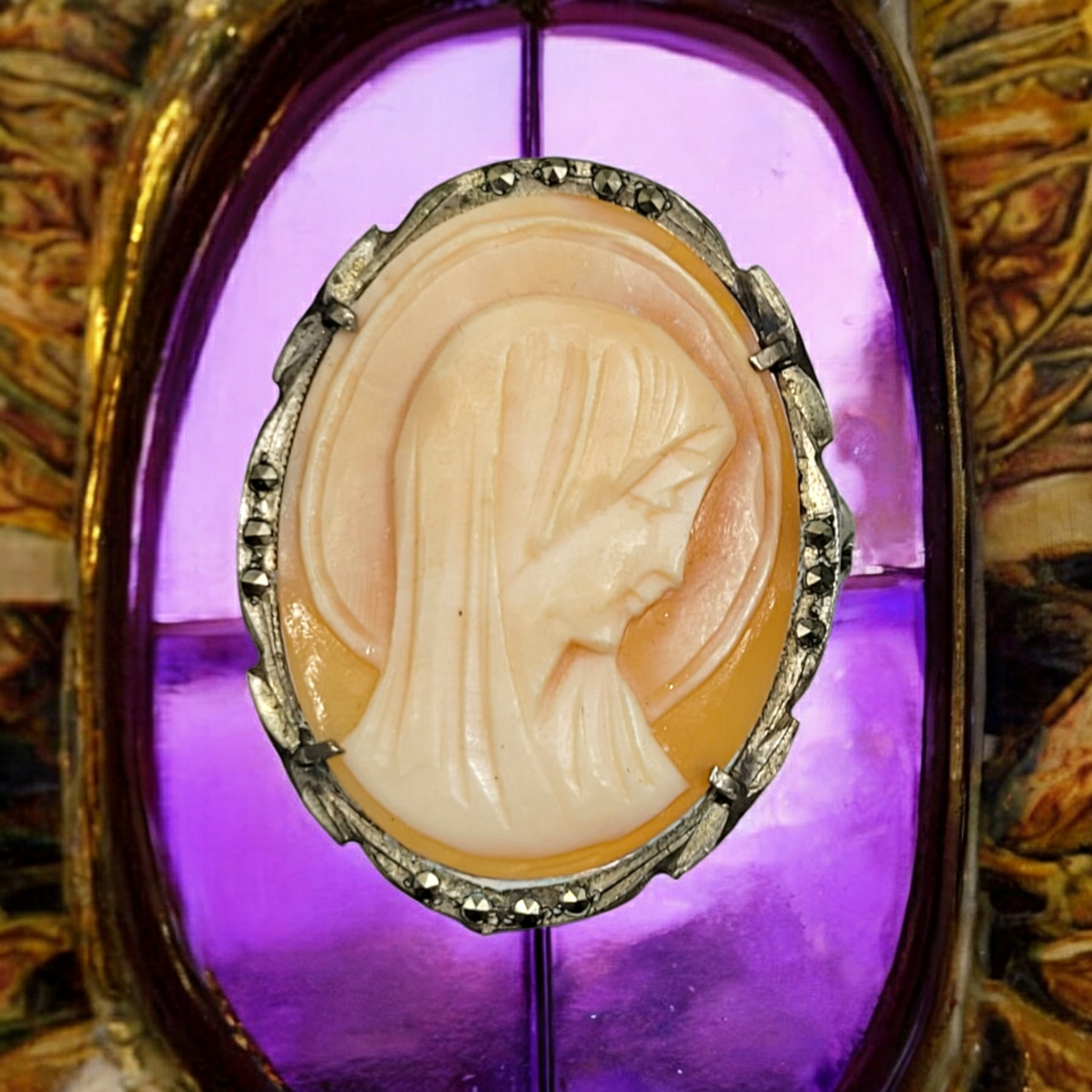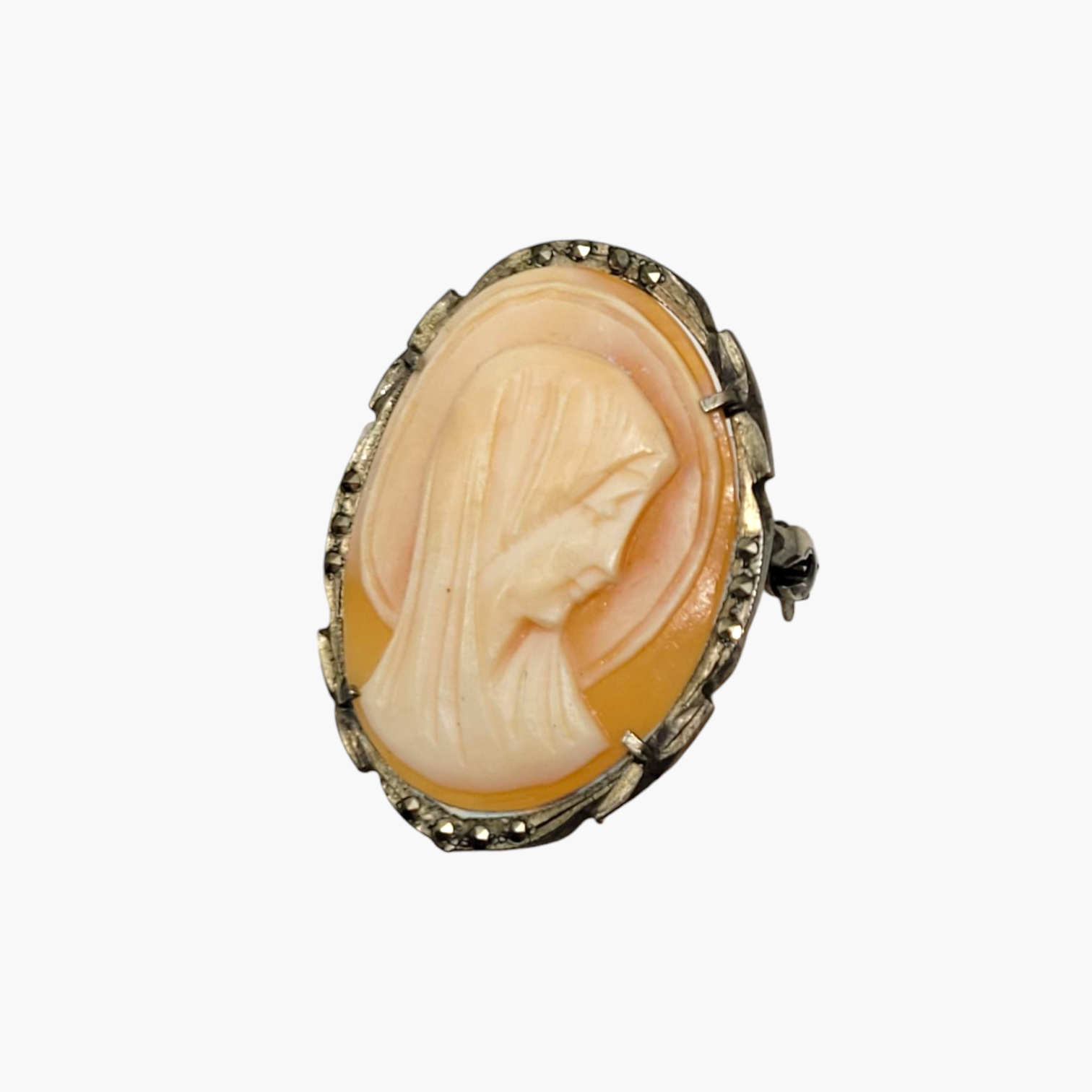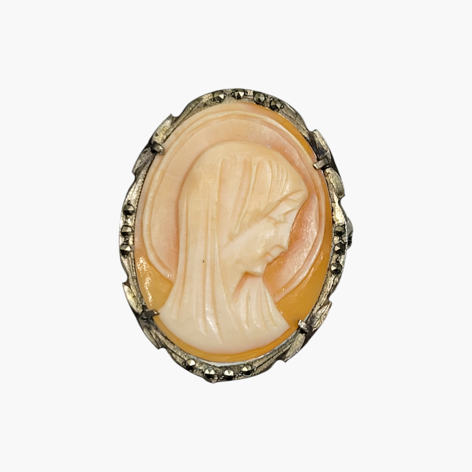 Vintage Mother Mary Cameo Brooch in Silver with Marcasite