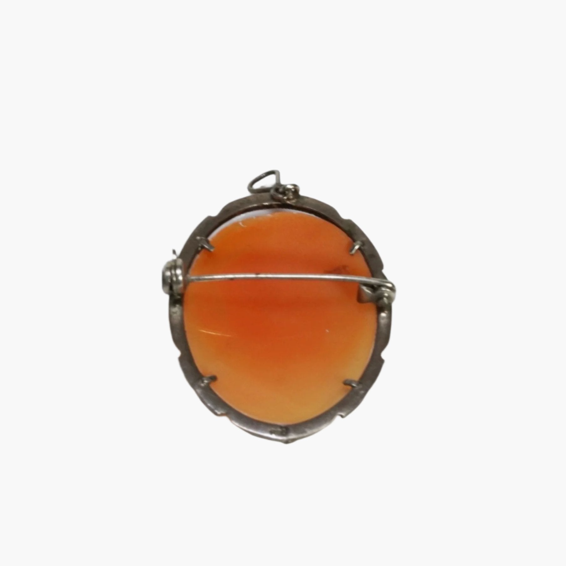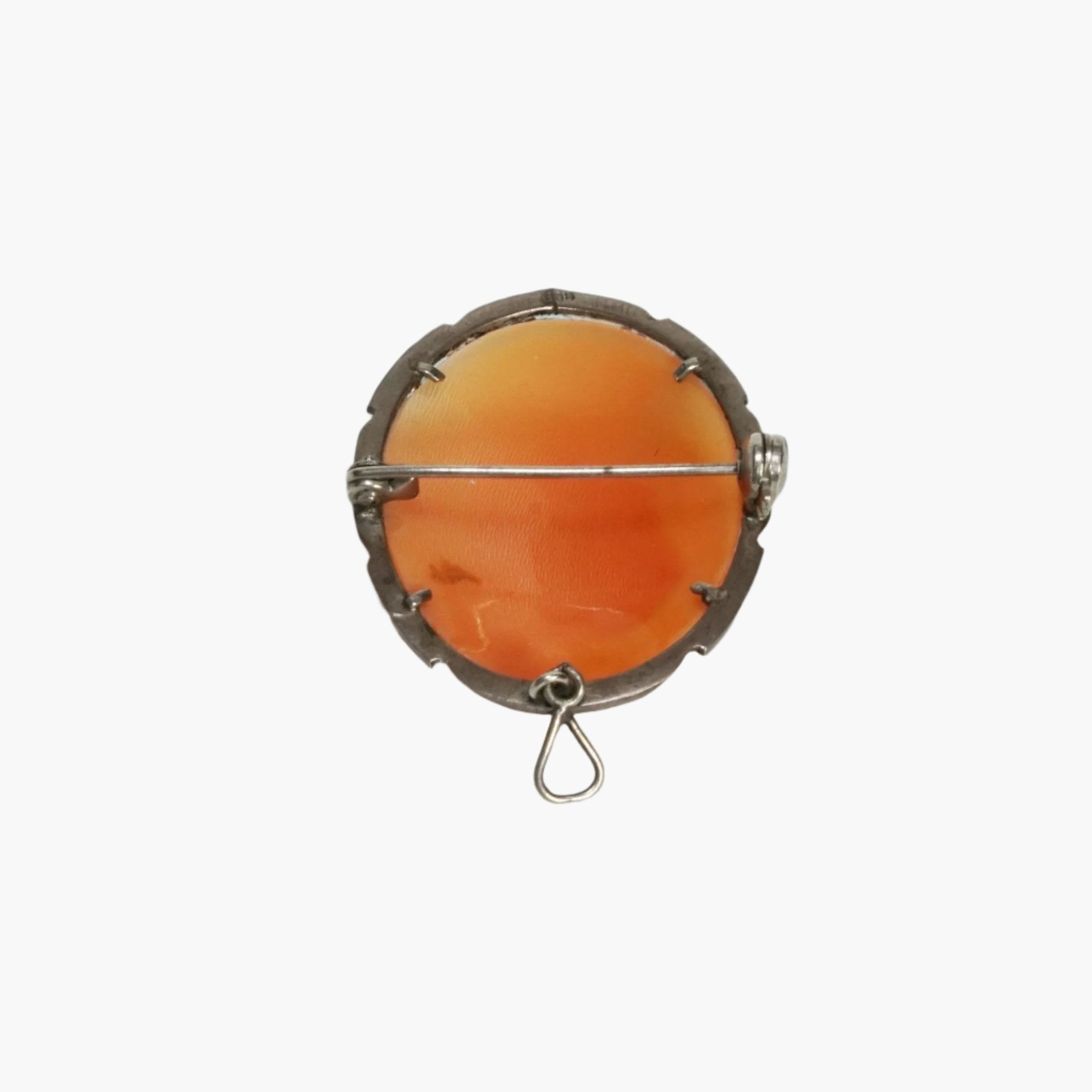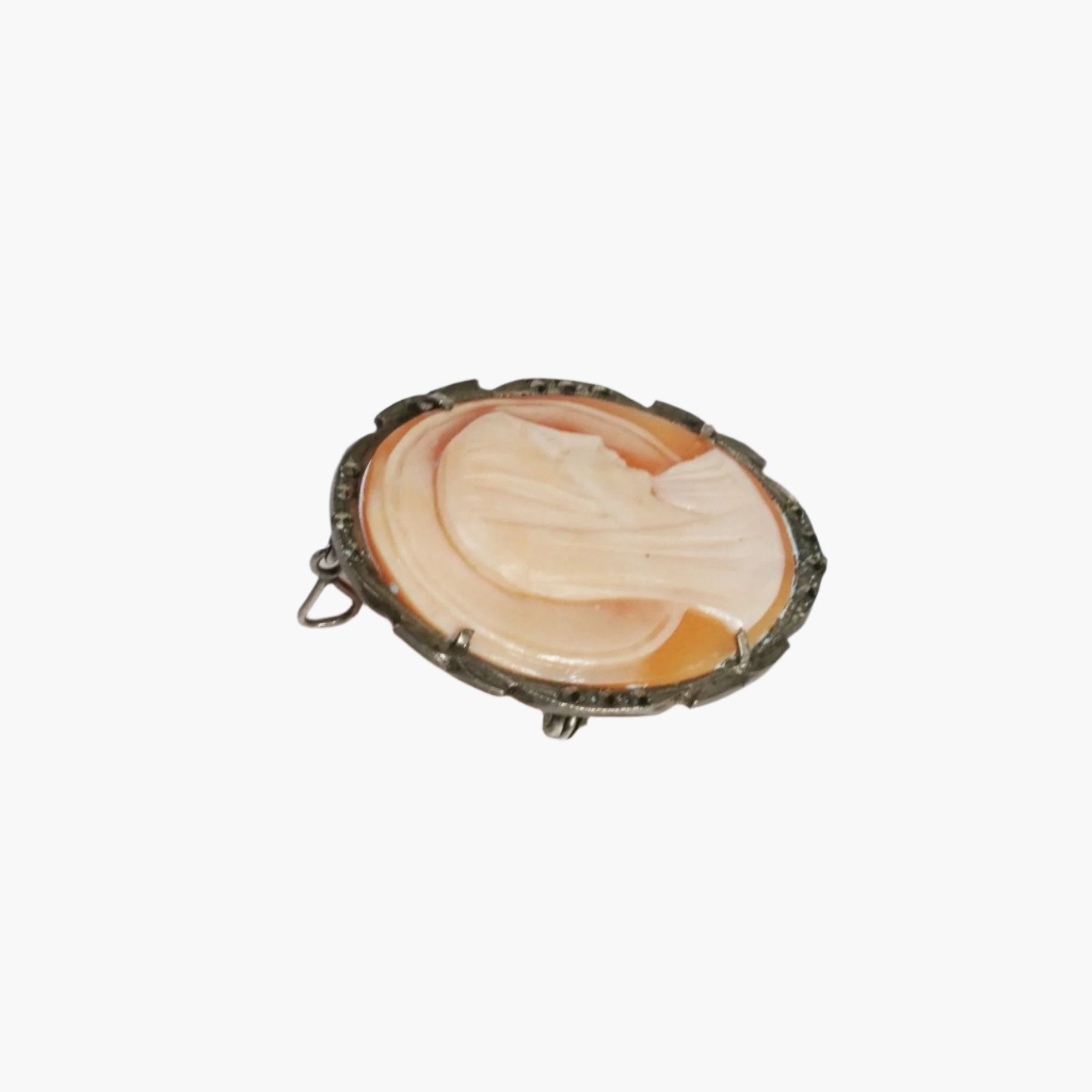 Discover a piece of timeless devotion with our Vintage Mother Mary Cameo Pendant & Brooch. This exquisite silver brooch, featuring the classic cameo design and sparkling marcasite stones, beautifully captures the grace and spiritual strength of the Virgin Mary. A treasured vintage find, it serves as both a beautiful adornment and a powerful symbol of faith.  The wire bail hangs or dangles under the setting.  The cameo itself is prong set.  It is vintage, from the 1940s.